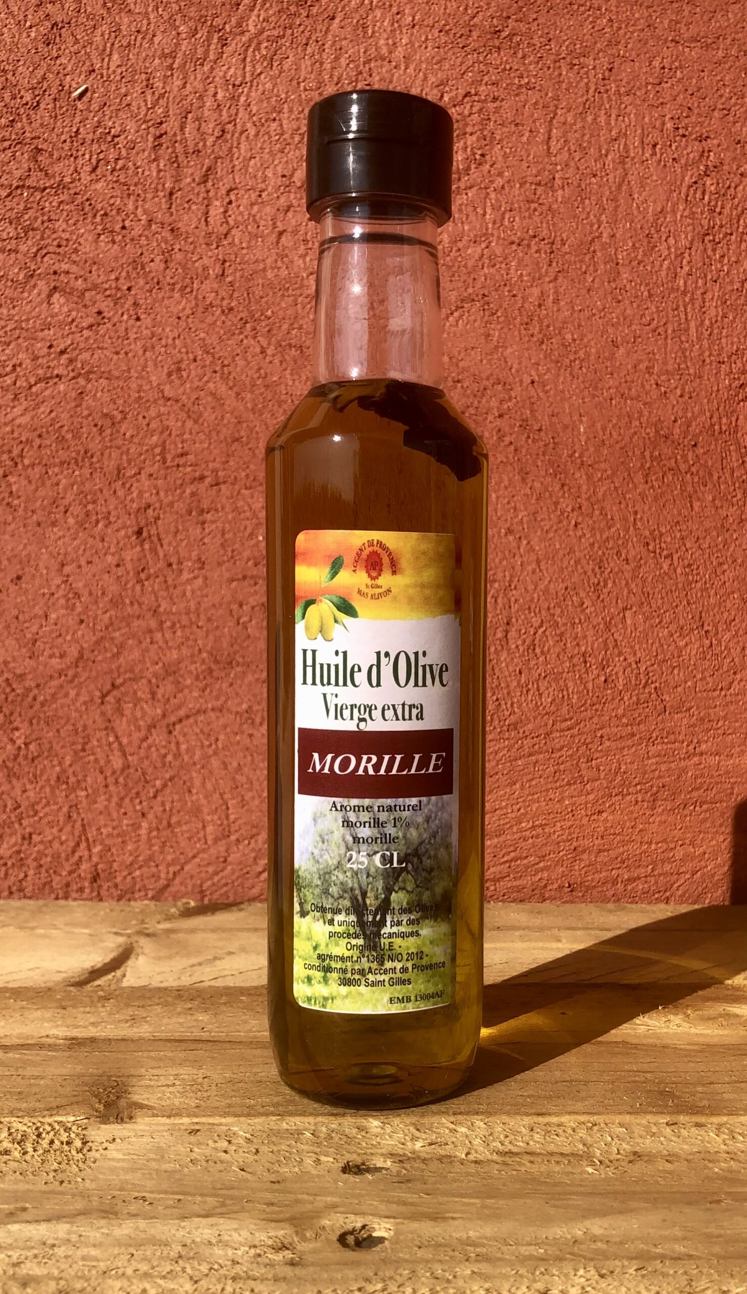 Une huile d’Olive Extra Vierge, pressée à Froid, aux Morilles, pour assaisonner