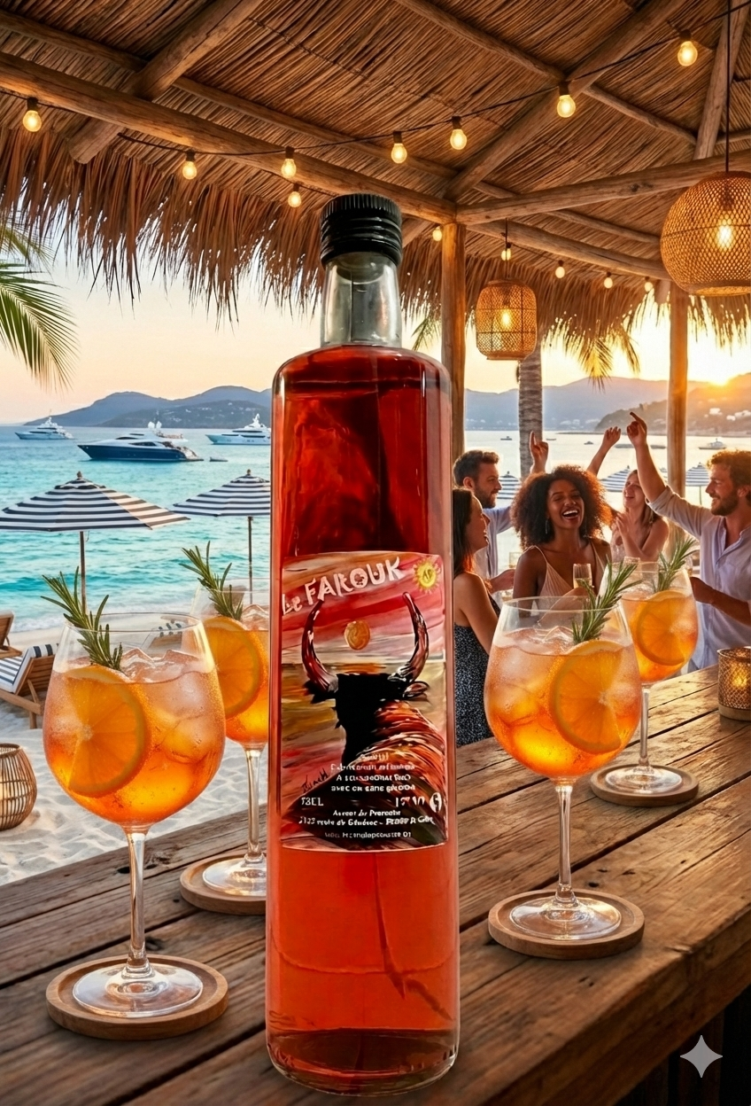 • Inspiré par l’univers coloré et puissant du peintre Farouk, nous avons créé une liqueur subtile et raffinée à 17°, à base d’alcool de fruits, de sucre et de notre touche secrète.